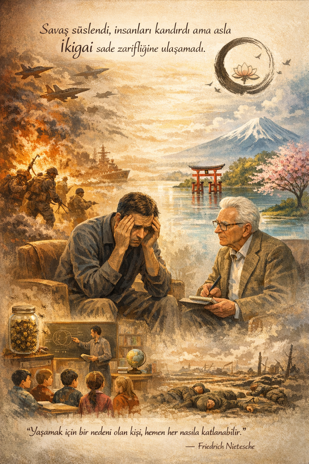 “Savaş süslendi insanları, kandırdı ama asla ikigai sade zarifliğine ulaşamadı.”